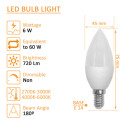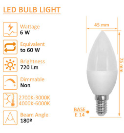 Dens SMD 2835 OSRAM Chip-dioder med høj lumen giver svarende til lysstyrken på en konventionel pære på omkring 50W. På denne måde opnås en energibesparelse på 80%. Det eksponerede lys fordeles i en vinkel på 180° og har et farvegengivelsesindeks på +80, hvilket indikerer kvaliteten af lyset leveret af vores 6W E14 C37 LED-pære.