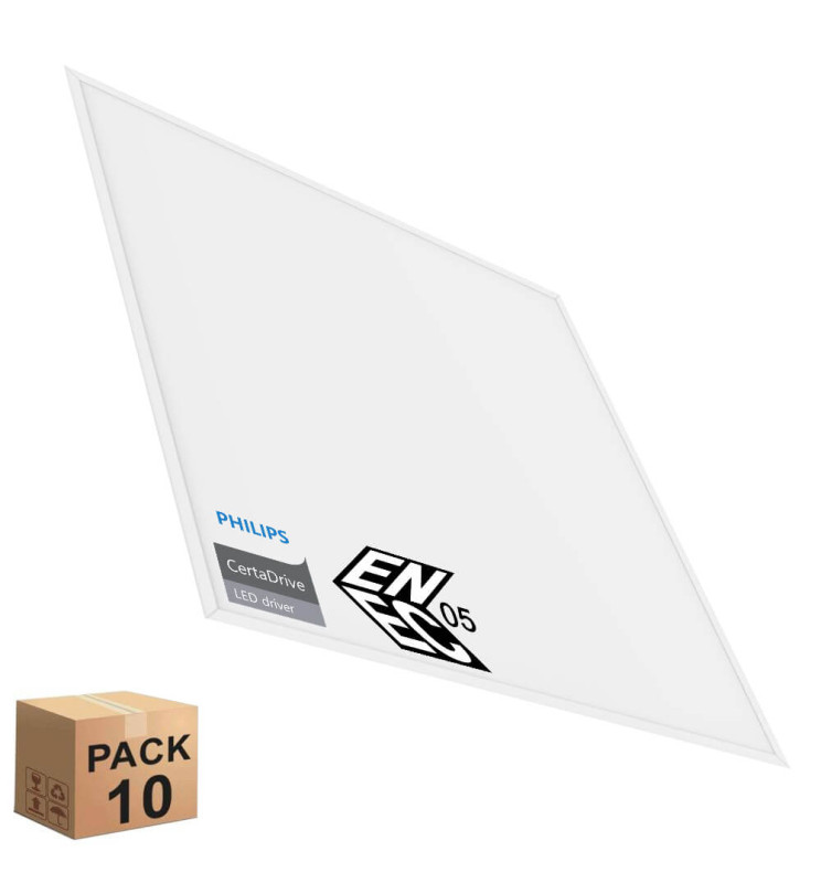 Pakke med 10 LED-paneler 60x60 40W med Philips-driver – Forbedr æstetikken i dine rum med dette ultratynde LED-panel i jern og uden synlig ramme, som giver maksimal elegance og større lysoverflade. Ideel til professionelle installationer med ensartet, flimmerfri belysning (NO FLICK), ENEC05-certificeret og med 5 års garanti. Det perfekte valg for dem, der søger effektivitet, design og kvalitet.