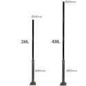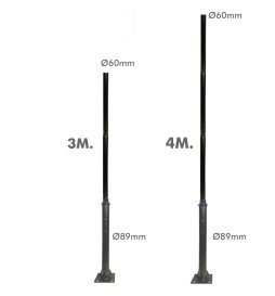 Øjeblikkelig service: Søjle, mast, stang til gadelys, boligområder, veje, bebyggelser. Fremstillet af galvaniseret stålrør Ø89mm ja Ø60mm, med en tykkelse på 2mm i diameter, malet i tekstureret sort - RAL9005 - af højeste kvalitet polyester for stor hårdhed og modstandskraft. Nem transport og montering, kan monteres i 3 eller 4 dele, hvilket gør installationen meget lettere for én person.