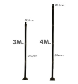 Øjeblikkelig service: Søjle, mast, stang til gadelys, boligområder, veje, bebyggelser. Fremstillet af galvaniseret stålrør Ø76mm, med en tykkelse på 2mm i diameter, malet i tekstureret sort - RAL9005 - af højeste kvalitet polyester for stor hårdhed og modstandskraft. Nem transport og montering, kan monteres i 3 eller 4 dele, hvilket gør installationen meget lettere for én person.