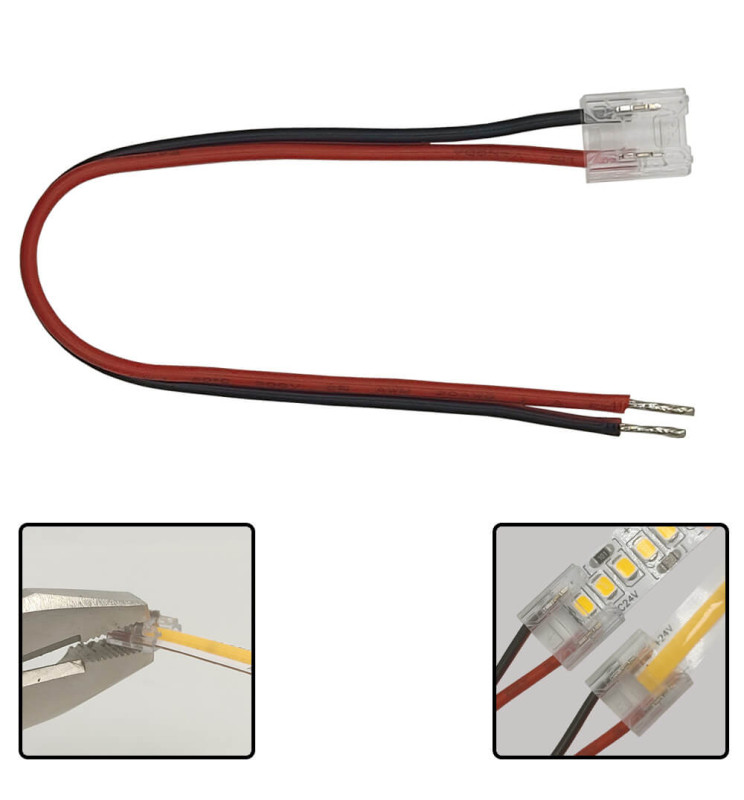 Med vores transparent kontakt kan du tilslutte alle typer af 8mm - 10mm LED-strips. Den omfatter anslutningskabel for enkel brug af kontakter.