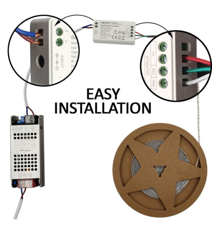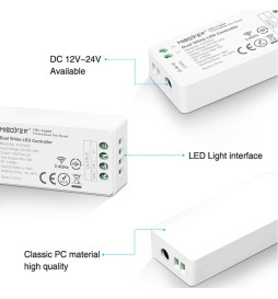 Entdecken Sie den 2-in-1-Controller für LED-Streifen, die ideale Lösung für alle, die ihre Beleuchtung personalisieren und optimieren möchten. Dieser für monokromatische und CCT (Dualweiß) LED-Streifen entwickelte 2,4 GHz RF-Dimmer ermöglicht es Ihnen, die Lichtintensität zu variieren und dynamische Effekte zu programmieren, wodurch einzigartige und an jede Situation angepasste Umgebungen entstehen.