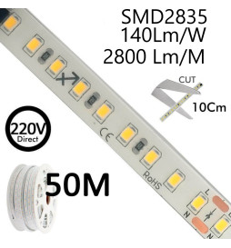 LED-Streifen 220V | 20W/M | 140xLED/m | 50m | SMD2835 | 2660Lm/M | IP67 | Schneiden alle 10cm
