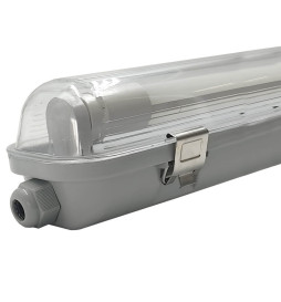 Robust und vielseitig, diese wasserdichte Leuchte ist für eine LED-Röhre von 120 cm (nicht enthalten) konzipiert. Hergestellt aus langlebigen Materialien wie ABS und Polycarbonat (PC), bietet sie hohen Schutz gegen Wasser und Staub (IP65) und eignet sich ideal für den Innen- und Außenbereich, z. B. Garagen, Lagerhallen oder feuchte Bereiche.