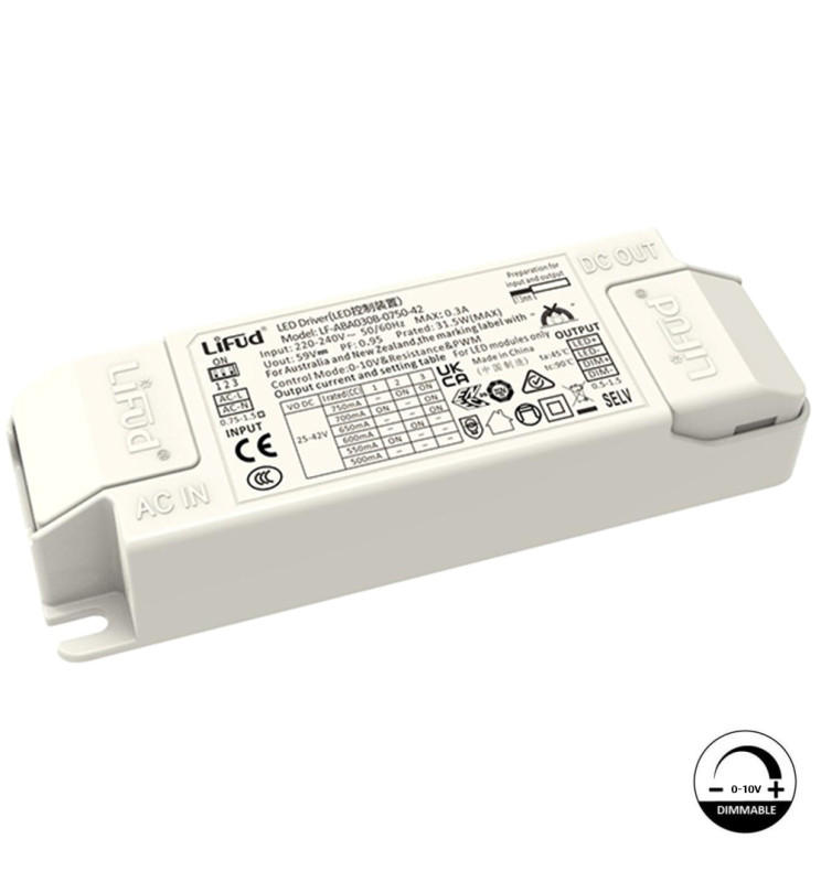 LIFUD 0–10V dimmbarer Treiber für LED bis 30W, optimiere deine Leuchten mit diesem flimmerfreien Treiber, ideal für LED-Downlights, Panels und Deckenleuchten. Mit Eingang AC220–240V und regulierbarem Ausgang DC25–42V (500–750mA) bietet er eine stabile Leistung und ist dank seines ausgangsseitigen, steckerlosen Designs vielseitig einsetzbar. Perfekt für professionelle Installationen, die Qualität und Vielseitigkeit verlangen.