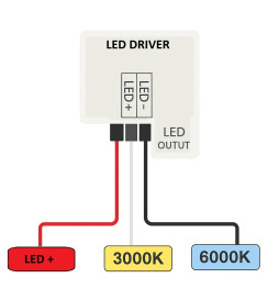 Supplied with GXtronic driver with CCT selector (3000K / 4000K / 6000K). If dimming is required, the selected LIFUD driver will be sent separately. Wiring: Red = positive (+), White = 3000K (–), Black = 6000K (–); to achieve 4000K, connect both negative wires.