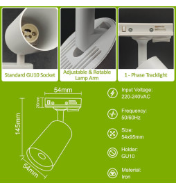 Monophase Track Spotlight for GU10 Bulbs, made of Iron, combines versatility and functional design. Its easy installation and adjustable orientation allow directing light in any direction, ideal for adapting lighting to your needs. Perfect for reading corners, shop windows, or product displays.