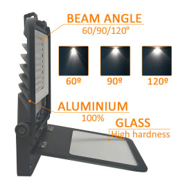 Professional MAXLITE LED Floodlight with adjustable power (50W/80W/100W) via DIP switch, ideal for demanding lighting applications in architectural, industrial, or urban projects requiring versatility and high performance. Features 3CCT technology (3000K/4000K/6500K), high-efficiency SOSEN driver, and IP65/IK08 protection. Comes standard with a 90° optic for precise lighting, with the option to replace it with a 60° lens for greater focus or remove the standard lens to expand the beam angle up to 120°, adapting light distribution to each application. With quick connector and anti-condensation valve, it ensures safe installation, long-lasting performance, and a 50,000-hour lifespan. 5-year professional warranty.