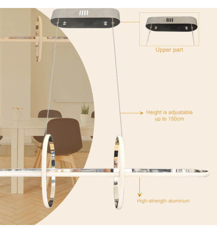 The lamp is made of high quality aluminum, with a shiny silver finish that gives it a modern and sophisticated look. The suspension cable is adjustable, so you can adapt the height of the lamp to your needs. The base and its accessories in white so as not to lose the main tone of the luminaire.