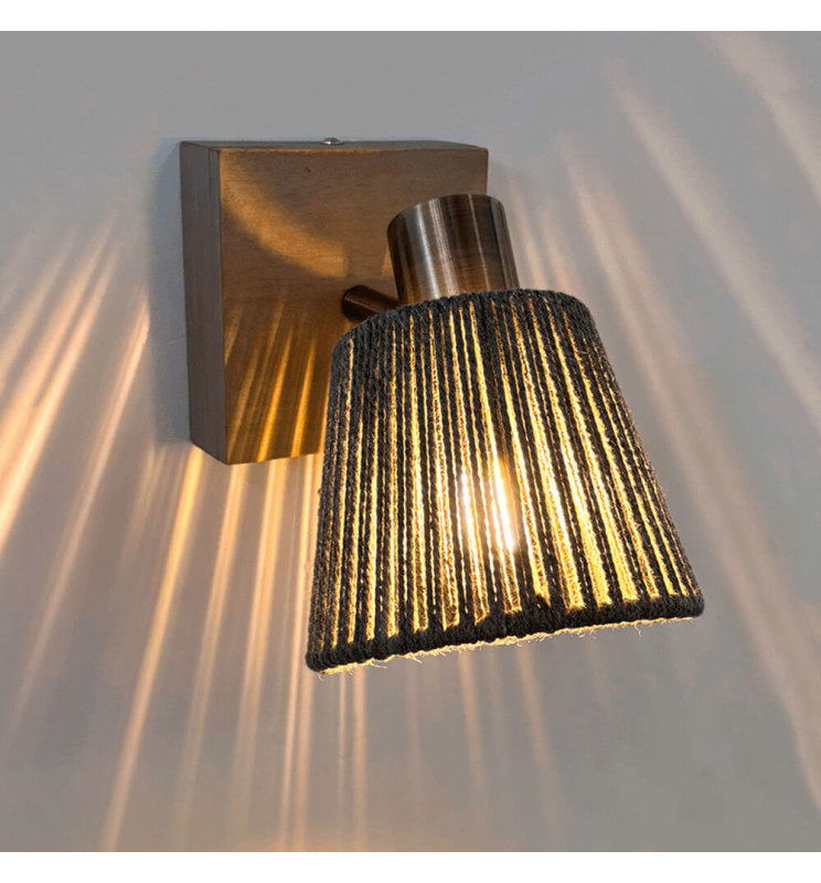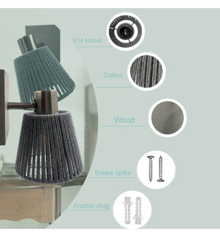 This wall lamp with E14 socket requires a bulb that is not included. It is made of aluminum with its wicker lampshade and a cotton lampshade