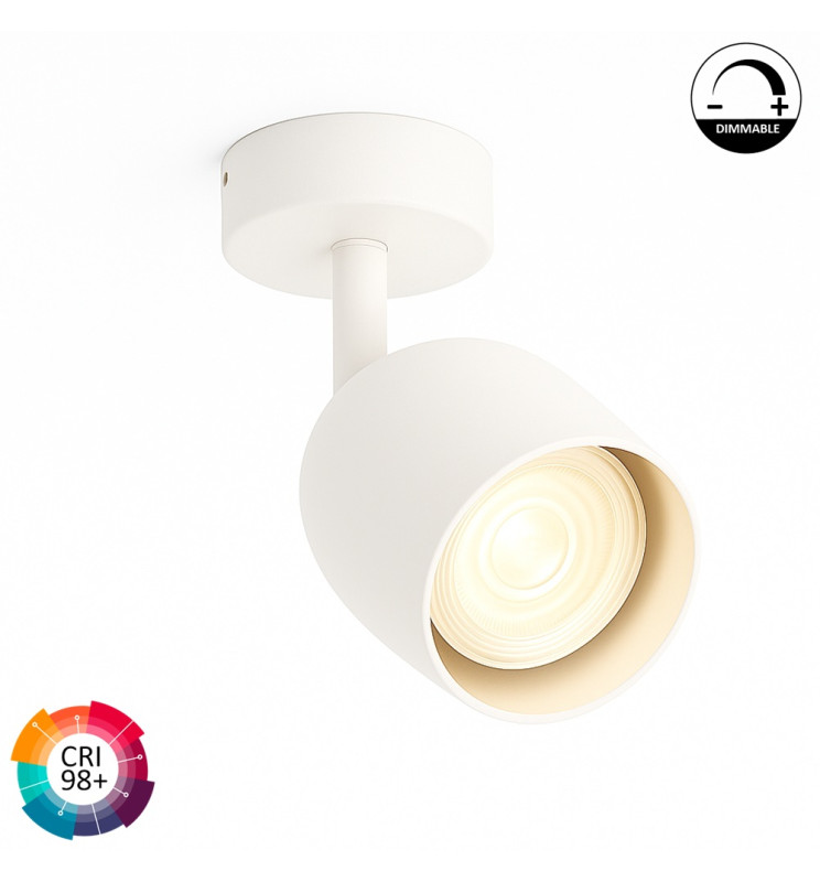 Adjustable ceiling or wall light with included GU10 bulb, dimmable via TRIAC. Features a crystal optic with 24º beam angle, high-efficiency SMD1A1A diode (150Lm/W), and CRI>98 for outstanding color rendering. Its functional design and easy installation allow you to direct warm light in any direction, making it ideal for reading corners, shop windows, or product displays.