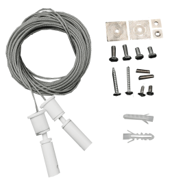 Precio 1,58 €Kit de suspensión compuesto por un cable de acero de 1 metros y todos los accesorios necesarios para convertir el carril monofásico de superficie en una instalación colgante de focos proyectores LED.