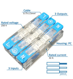 ¿Quieres ahorrar tiempo y dinero?: El conector rápido 3 Entradas - 3 Salidas - KV221-415 - para cable eléctrico se utiliza para realizar conexiones rápidas y seguras en todo tipo de alumbrado de iluminación y también en instalaciones eléctricas tanto temporales y permanentes. Con estos conectores rápidos y seguros, se consigue un gran ahorro de costes en el montaje.