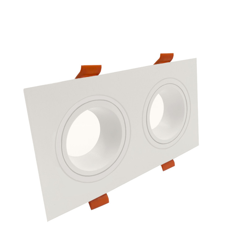 El aro blanco doble orientable para dos GU10 es un accesorio de iluminación elegante y funcional, diseñado para ofrecer una solución de iluminación flexible y precisa en interiores.