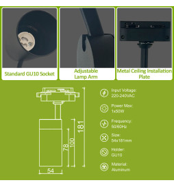 Foco de Carril Monofásico para Bombillas GU10, fabricado en aluminio, combina versatilidad y diseño funcional. Su fácil instalación y capacidad orientable permiten dirigir la luz en cualquier dirección, ideal para adaptar la iluminación según tus necesidades. Ideal para rincones de lectura, escaparates o presentaciones de productos.