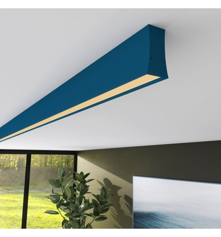 Disponible en varias longitudes y en versiones suspendidas o adosadas al techo, para adaptarse a diversas necesidades y alturas de instalación. Las luminarias, de hasta 2 metros de longitud, se convierten en bellos trazos de luz que modelan el espacio.