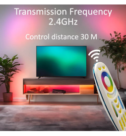 El Control remoto RGB + CCT 4 zonas es la solución perfecta para gestionar de manera eficiente la iluminación de tus espacios. Permite regular el color, la saturación, el brillo y la temperatura de color (de cálido a frío) en hasta 4 zonas diferentes, con la flexibilidad de crear grupos y combinaciones según tus necesidades. Su diseño intuitivo incluye una rueda giratoria y barras táctiles, facilitando el ajuste preciso. Con una distancia de transmisión de 30 metros y tecnología de RF a 2.4GHz, garantiza un control rápido y sin interferencias, ideal para cualquier entorno.