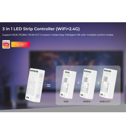 Control 3 en 1: compatible con tiras LED RGB, RGBW y RGB+CCT, todo en un solo dispositivo.