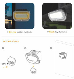 Solución eficiente y sostenible para la iluminación exterior. Equipado con un sensor de presencia PIR, este dispositivo utiliza la energía solar para cargar su batería, garantizando un funcionamiento autónomo y respetuoso con el medio ambiente. Su temperatura de color de la luz principal es de 5700K, mientras que el modo anillo de luz es de tono amarillo.