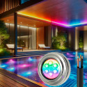 El Foco - RGB - para piscina de 12W de potencia se caracteriza por su lente de óptica soldada por fricción, especialmente desarrollada para la iluminación subacuática, distribuye la luz alrededor de la piscina de manera uniforme y excelente sin deslumbrar a los bañistas, lo que hace de la lámpara un luz fiable y eficiente para su funcionamiento.