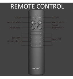 El control remoto admite control individual de 4 zonas, un control remoto puede funcionar con receptores ilimitados en 30 m, puede atenuar el brillo y la temperatura del color y es compatible con 2.4G como controladores y luces. Crea fácilmente una escena de iluminación portátil y cómoda.