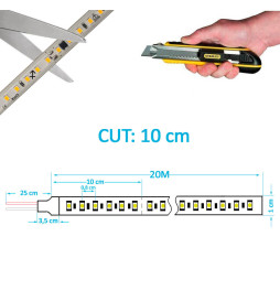 Tira led de 220V con una longitud 20 metros 14W/m. 10mm. Diseñada para su colocación en exteriores. Perfecta para ILUMINAR todo tipo de espacios. NO requiere de fuente de alimentación y es conveniente instalarla sobre un perfil de aluminio para conseguir una buena disipación del calor. Se puede cortar cada 10cm