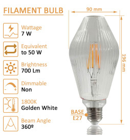 Tämä 7W LED-filamenttihuopa diamond, jossa on kurpitsan muotoinen suunnittelu, valmistettu kuvioidusta lasista ja varustettu E27-kannalla, on ympäristöystävällinen valinta energiatehokkuutensa ansiosta. Sen houkutteleva moderni ja elegantti muotoilu, joka on tunnusomaista sen kurpitsan muotoiselle kuvioidulle lasikuorelle, täydentää tyylikkäästi minkä tahansa sisustuksen.