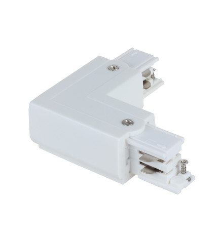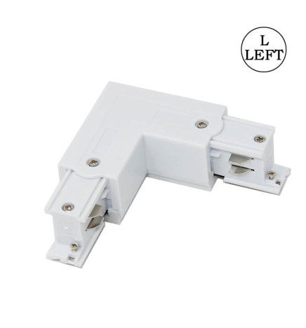 Connecteur type L" rail triphasé GAUCHE", disponible en blanc et noir. Il est composé de matériaux très résistants et de grands conducteurs d'électricité, tels que l'aluminium et le thermoplastique ignifugé.