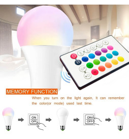Modes d'Éclairage Avancés - L'ampoule LED offre plusieurs modes préconfigurés que vous pouvez sélectionner depuis la télécommande. Ces modes incluent des transitions douces entre les couleurs, des clignotements rythmiques, et un mode de lumière fixe. De plus, vous pouvez ajuster la luminosité de la lumière pour l'adapter à différents besoins et situations, que ce soit une lumière douce pour la nuit ou une lumière vive pour les activités nécessitant de la concentration.