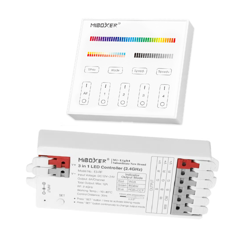 - Modes de sortie variables : Changez entre RGB, RGBW et RGB+CCT avec un bouton.