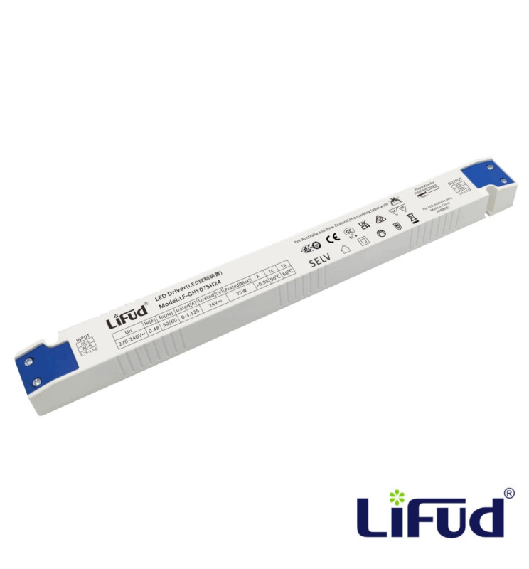 Alimentatore Slim Professionale LIFUD 75W 24V, ideale per strisce LED e installazioni di illuminazione esigenti. Converte efficacemente la corrente AC in DC, con un design compatto, resistente e compatibile con i profili. Certificato a livello internazionale (ENEC, CE, UKCA…) e con 5 anni di garanzia, offre la massima affidabilità e sicurezza in ogni progetto. Affidati alla qualità professionale di LIFUD per le tue installazioni!