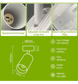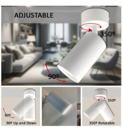 Plafoniera orientabile per 1 lampadina GU10, unisce versatilità e design funzionale. La facilità di installazione e la portata regolabile consentono di orientare la luce in qualsiasi direzione, ideale per adattare l'illuminazione alle proprie esigenze. Ideale per angoli di lettura, vetrine o presentazioni di prodotti.