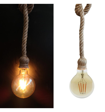 Lampada a sospensione in corda di lino per montaggio a soffitto, attacco E27, da abbinare alle nostre lampadine a filamento vintage per creare atmosfere rétro.