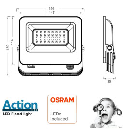 Faretto proiettore LED 30W - ACTION PRO - OSRAM CHIP DURIS E2835- IP65: La scelta perfetta per un'illuminazione potente e durevole. Questo faretto proiettore LED da 30W , dotato della tecnologia all'avanguardia OSRAM CHIP DURIS E2835, offre un'illuminazione luminosa ed efficiente. Con la classificazione IP65, è resistente all'acqua e alla polvere, rendendolo ideale sia per l'uso interno che esterno.