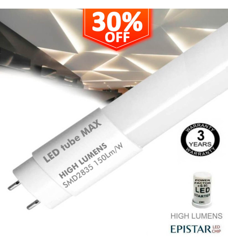 Il TUBO MAX LED HIGH LUMINOSITY SMD 2835 EPISTAR 150 Lm/W, con fattore di potenza +0,90 e potenza di 13W è una soluzione eccellente ed economica per la sostituzione dei tubi fluorescenti T8. Include un ponte di partenza. Senza la necessità di modificare lo schermo, sostituisce l'avviatore con il 'fusibile'. Fa risparmiare tempo e denaro. Collegamento unilaterale.