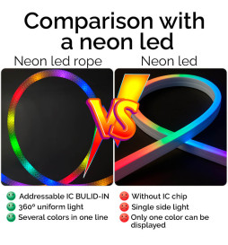 Neon LED RGB SMART 360º. Perfekt for å skape stemning og dekorasjon, inneholder dette settet en 5-meters LED-stripe, en infrarød fjernkontroll og en strømadapter med 5V USB-utgang. Med millioner av tilpassbare farger og dynamiske effekter kan du enkelt kontrollere belysningen via APP-en på smarttelefonen din eller med den medfølgende fjernkontrollen. Vannbestandig (IP65), ideell for både innendørs og utendørs bruk. Skap unike og levende atmosfærer med et enkelt trykk!