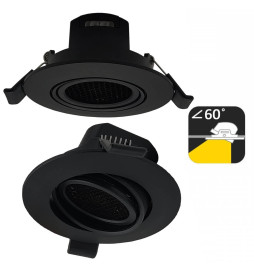 Svart innfelt spotlight - UGR19 - Justerbar sirkulær LED med 7W effekt. Med en åpningsvinkel på 60º, slik at belysningen blir mer direkte og lyset fokuseres på bestemte punkter. Den skiller seg ut fordi den kan dreies 360º og rotere 24º, noe som gir belysning til alle interessante områder.
