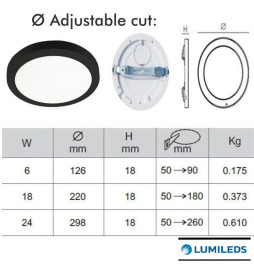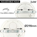 Har du problemer med at hullet er for stort eller for lite til å installere downlight eller LED-taklampe? Løsningen! Med den nye modellen av MOSS armatur med 24W effekt, JUSTERBAR HULLDIAMETER (hulldiameter fra 50 mm til 260mm) og valgbar farge, vil du ikke ha noen problemer med å installere den, siden den tilpasser seg hullets diameter takket være skyvesystemet på festet. NÅ KAN DU NYTE DOWNLIGHT + TAK + CCT + JUSTERBAR! 6 PRODUKTALTERNATIVER I BARE 1!