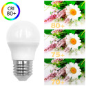 Den medfølgende OSRAM Chip High Brightness SMD 2835-dioder tilsvarer lysstyrken til en vanlig pære på rundt 50W. På denne måten oppnås en energibesparelse på 80%. Det eksponerte lyset fordeles i en vinkel på 220° og har en fargegjengivelsesindeks på +80, noe som indikerer kvaliteten på lyset som leveres av vår 6W E27 G45 LED-pære.