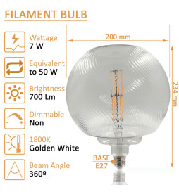 Denne 7W LED-filamentpæren GLOBE med en design som ligner en gresskar, laget av mønstret glass og med en E27-sokkel, er et miljøvennlig valg på grunn av sin energieffektivitet. Den tiltalende moderne og elegante designen, kjennetegnet av sitt mønstrede glasshus i form av et gresskar, vil komplementere enhver innvendig dekor med stil.