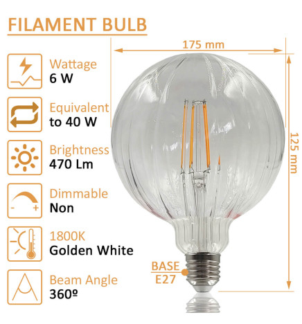 Denne 6W LED-filamentpæren med en design som ligner en gresskar, laget av mønstret glass og med en E27-sokkel, er et miljøvennlig valg på grunn av sin energieffektivitet. Den tiltalende moderne og elegante designen, kjennetegnet av sitt mønstrede glasshus i form av et gresskar, vil komplementere enhver innvendig dekor med stil.