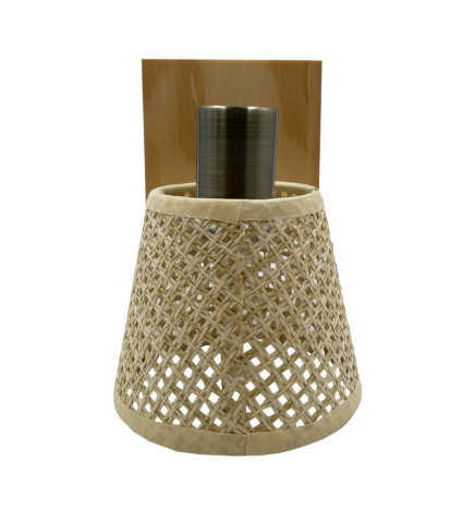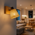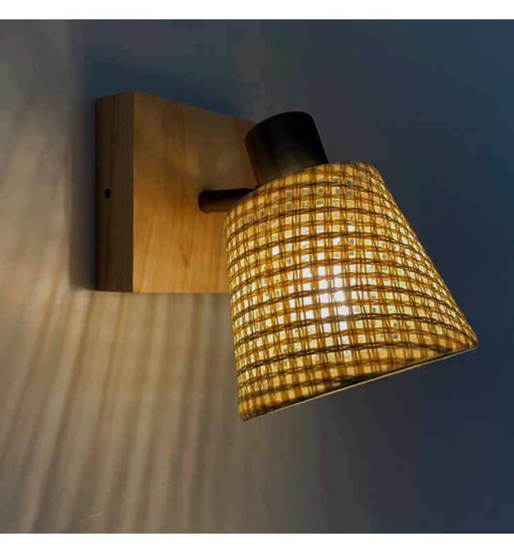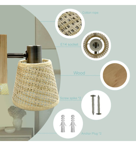 Denne vegglampen med E14-sokkel krever en pære som ikke er inkludert. Den er laget av aluminium med flettet skjerm og trefot, noe som gjør den ideell for en naturlig innredning i elegant stil.