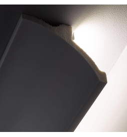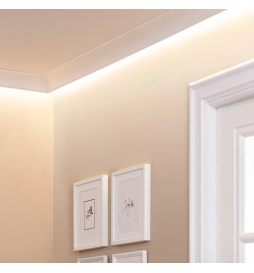 Polystyrenlisten er spesielt designet for å integrere aluminiumsprofiler med LED-striper, og tilbyr en dekorativ løsning som forvandler ethvert rom med indirekte og dekorativ belysning. Dette produktet gjør det mulig å skape spektakulære effekter i interiørdekorasjonen, og tilfører ikke bare lys, men også eleganse og dynamikk. Ved å integrere belysningsprofiler inni, forvandler denne listen tak og vegger til ekte kunstverk, og integrerer linære former med en myk glød av lys.