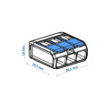 Den raske 3-inngangskontaktoren, modell KV221-415, er designet for å lette raske og sikre elektriske tilkoblinger i en rekke belysningssystemer, samt i midlertidige og permanente elektriske installasjoner. Disse kontaktorene tilbyr en effektiv og pålitelig løsning for å oppnå betydelige besparelser i monteringskostnader.