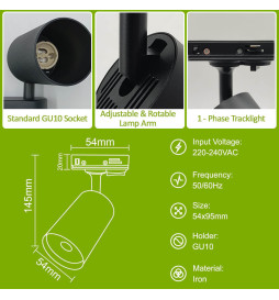Preço 5,17 €Foco monofásico de calha preto para lâmpadas de parafuso GU10. É feito de alumínio. Fácil de in