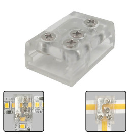 Preço 0,73 €Conector de parafuso sem solda para fitas SMD IP20 não impermeáveis com PCB de 10mm. O nosso conector IP20 permite a realização de ligações em tiras de LED sem soldadura, simplesmente apertando dois parafusos como as tiras convencionais. Super fácil de encaixar.