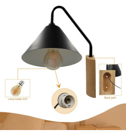 O Aplique preto com casquilho de madeira para lâmpada E27 é uma opção moderna e natural para qualquer espaço interior. O seu design minimalista e intemporal adapta-se a qualquer estilo de decoração, do clássico ao moderno. O abajur tem uma forma cónica com uma abertura de 120º, para distribuir a luz uniformemente e iluminar mais espaço.