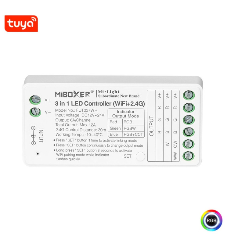 Controlador LED WiFi 3 em 1 RGB + RGBW + RGBCCT - RF 2,4 GHz - 12-24V