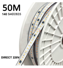 Esta Fita LED 220V DC 140LED/m IP67 tem um comprimento de 50 metros e integra 140 LEDs de tecnologia SMD2835 altamente eficientes que consomem apenas 20w por metro. A luz brilhante e colorida que emite está espalhada por um ângulo de 120°.