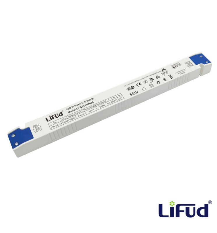 Fonte de Alimentação Slim Profissional LIFUD 100W 24V, ideal para fitas LED e instalações de iluminação exigentes. Converte corrente AC em DC de forma eficiente, com design compacto, resistente e compatível com perfis. Certificada internacionalmente (ENEC, CE, UKCA…) e com 5 anos de garantia, oferece máxima fiabilidade e segurança em qualquer projeto. Confie na qualidade profissional da LIFUD para as suas instalações!
